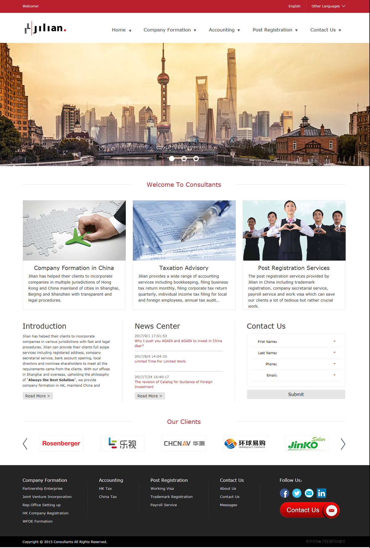 Jilian Consultants is a professional and experienced consultancy firm located in Shanghai, providing solutions to its clients worldwide. With our qualified, experienced and multilingual team, we are able to provide assistance in areas of finance, taxation, investment, corporate law and company management of the highest efficiency and reliability to maximize our clients’ commercial competitiveness whilst minimizing their legal risks.