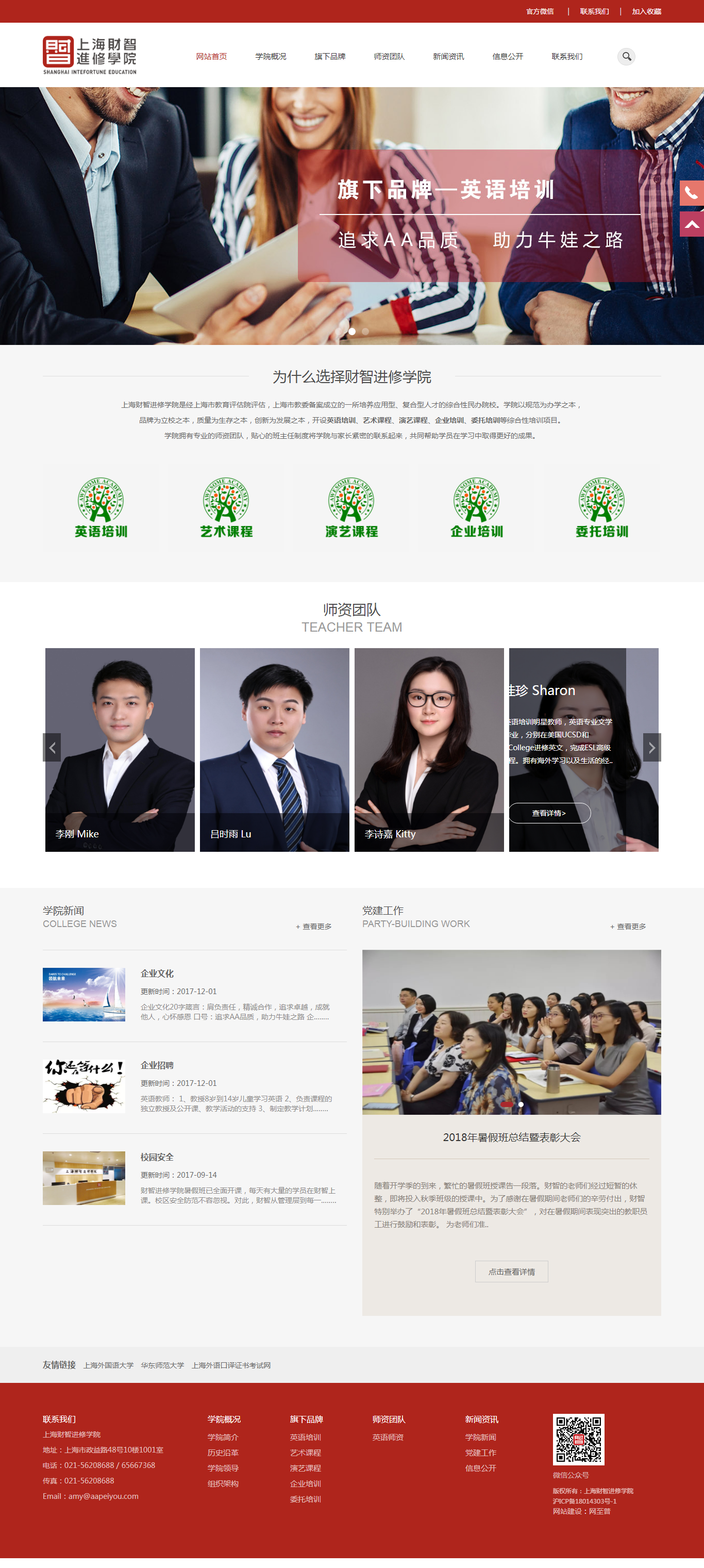 上海財(cái)智進(jìn)修學(xué)院是經(jīng)上海市教育評估院評估,上海市教委備案成立的一所培養(yǎng)應(yīng)用型、復(fù)合型人才的綜合性民辦院校。學(xué)院以規(guī)范為辦學(xué)之本,品牌為立校之本,質(zhì)量為生存之本,創(chuàng)新為發(fā)展之本,開設(shè)英語培訓(xùn)、藝術(shù)課程、演藝課程、企業(yè)培訓(xùn)、委托培訓(xùn)等綜合性培訓(xùn)項(xiàng)目。學(xué)院擁有專業(yè)的師資團(tuán)隊(duì),貼心的班主任制度將學(xué)院與家長緊密的聯(lián)系起來,共同幫助學(xué)員在學(xué)習(xí)中取得更好的成果。